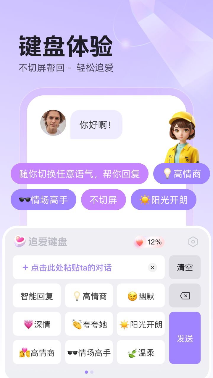 追爱键盘app是一款功能丰富的输入法应用,旨在为用户提供更加便捷、有趣和个性化的输入体验。使用追爱键盘,您可以快速回复消息,而无需担心回复问题,提供丰富的回复选项,让您轻松聊天,轻松应对各种情况。